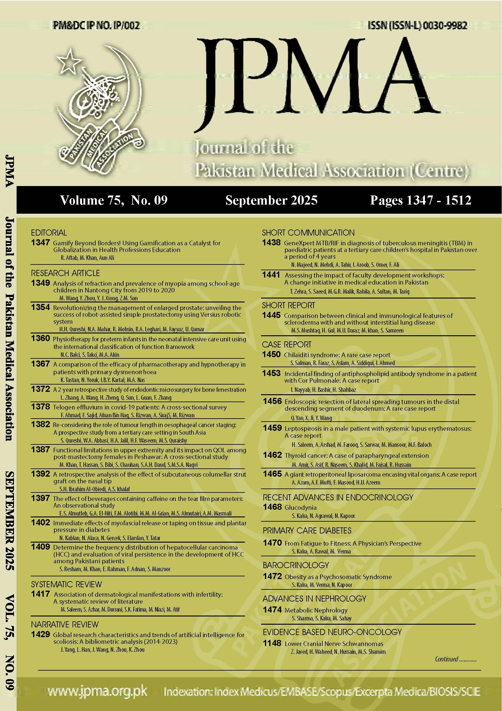 Telogen effluvium in covid-19 patients: a cross-sectional survey Authors Faisal Ahmad Department of Dermatology, PAF Hospital, Islamabad, Pakistan Fatima Sajid Department of Dermatology, PAF Hospital, Islamabad, Pakistan Afnan Bin Haq Department of Dermatology, PAF Hospital, Islamabad, Pakistan Shayan Rizwan Final Year MBBS Student, Fazaia Medical College, Islamabad, Pakistan Ayesha Siraj Department of Dermatology, PAF Hospital, Islamabad, Pakistan Muneeza Rizwan Department of Dermatology, PAF Hospital, Islamabad, Pakistan DOI: https://doi.org/10.47391/JPMA.21262 Keywords: COVID-19, Pandemic, Real-time polymerase chain reaction, Severe acute respiratory syndrome coronavirus-2 Abstract Objective: To determine the frequency of telogen effluvium in post-coronavirus disease-2019 patients. Method: The cross-sectional study was conducted at the Department of Dermatology, Pakistan Air Force Hospital, Islamabad, Pakistan, from February 10 to August 10, 2022, and comprised coronavirus disease-2019 patients of either gender aged 14-60 years. Telogen effluvium was defined as diffuse, non-scarring shedding of hair. Patients’ own approximate assessment of the degree of hair loss using 60-second timed hair count for 3 consecutive days was taken as a subjective tool to grade the severity of hair loss per day as mild (<20 hair/day), moderate (20-70 hair/day), severe (71-100 hair/day) and very severe (>100 hair/day). The severity of coronavirus disease-2019 was assessed through high-resolution computed tomography chest severity scoring as mild (0-9), moderate (10-19) and severe (>20). Data was analysed using SPSS 23. Results: Of the 160 patients, 83(51.9%) were males. The overall mean age was 30.72±6.026 years, and the mean coronavirus disease-2019 severity score was 12.83±5.16. Telogen effluvium was noted among 46(28.8%) patients; 8(17.4%) mild, 21(45.7%) moderate, 12(26.1%) severe, and 5(10.8%) very severe. Females had a significantly higher frequency of telogen effluvium compared to males (p<0.01). Conclusion: Telogen effluvium was noted as one of the frequent consequences of the coronavirus disease-2019, and it was strongly associated with the female gender. Key Words: COVID-19, Pandemic, Real-time polymerase chain reaction, Severe acute respiratory syndrome coronavirus-2. Downloads Full Text Article Published 2025-08-26 How to Cite Ahmad, F., Sajid, F., Bin Haq, A., Rizwan, S., Siraj, A., & Rizwan, M. (2025). Telogen effluvium in covid-19 patients: a cross-sectional survey. Journal of the Pakistan Medical Association, 75(09), 1378–1381. https://doi.org/10.47391/JPMA.21262 More Citation Formats ACM ACS APA ABNT Chicago Harvard IEEE MLA Turabian Vancouver Download Citation Endnote/Zotero/Mendeley (RIS) BibTeX Issue Vol. 75 No. 09 (2025): SEPTEMBER Section RESEARCH ARTICLE License Copyright (c) 2025 Journal of the Pakistan Medical Association This work is licensed under a Creative Commons Attribution 4.0 International License.